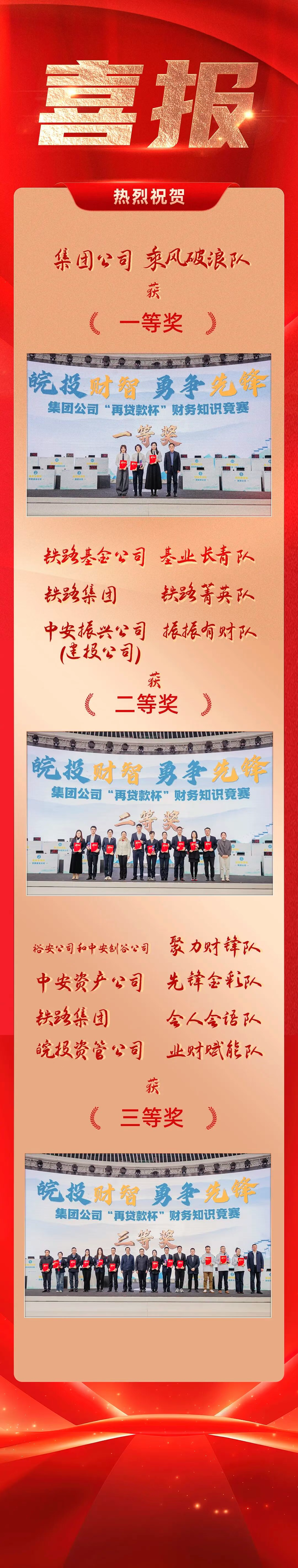 竞赛启动以来,得到了集团总部及各二级管理公司的积极响应,最终组成了 15 支代表队参赛。比赛现场设置团队必答、限时抢答、风险挑战等五大环节,经过2小时的激烈角逐,集团公司荣获一等奖,铁路基金公司、铁路集团第一代表队、中安振兴公司(建投公司)代表队荣获二等奖,裕安公司和中安创谷联合代表队、中安资产公司、铁路集团第二代表队、皖投资管公司荣获三等奖。