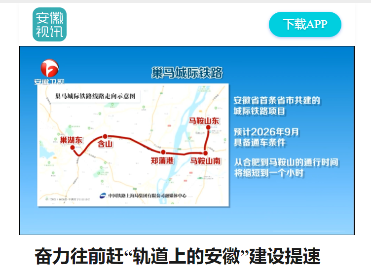 报道指出,在建重点铁路项目正在快马加鞭推进。上海至南京至合肥高铁安徽段接触网首杆组立,淮北至宿州至蚌埠城际铁路全线连续梁合龙,巢湖至马鞍山城际铁路全线控制性工程——马鞍山长江公铁大桥合龙,合肥西站年底同步开通运营。其中,作为安徽省首条省市共建的城际铁路项目,巢马城际铁路预计2026年9月具备通车条件,届时从合肥到马鞍山的通行时间将缩短到一个小时。