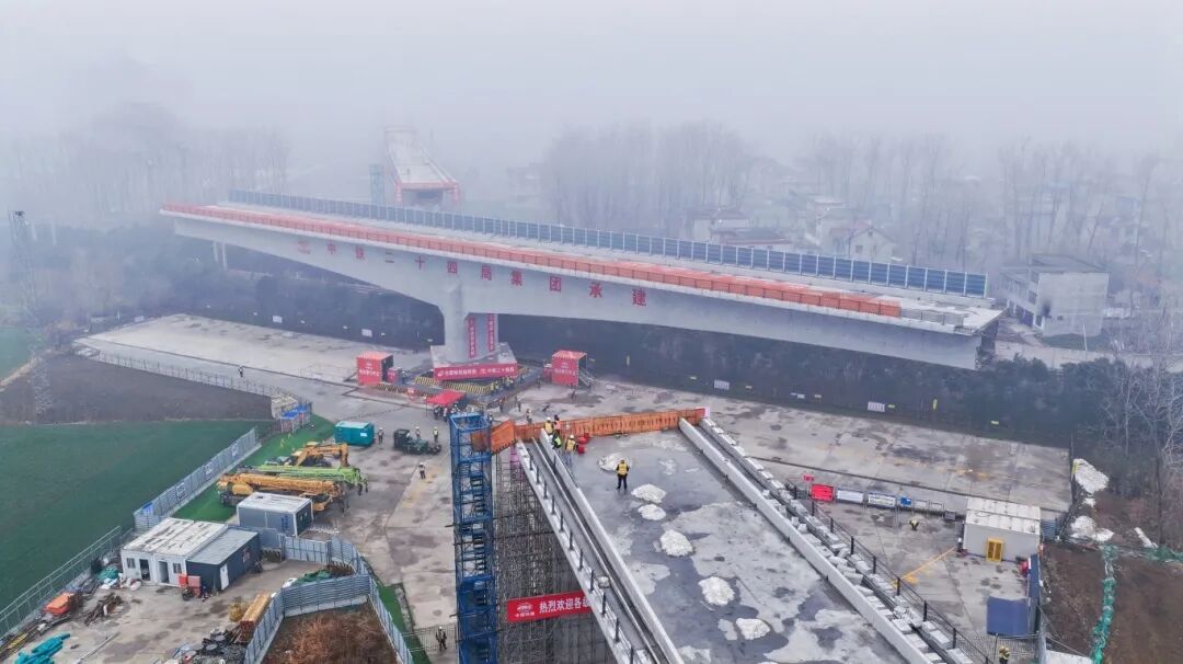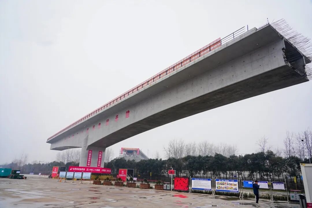 阜淮铁路最大跨度T构连续梁成功转体,标志着项目全线铺轨通道顺利贯通,为后续推进无砟轨道、铺轨施工等扫清了关键障碍。当前,阜淮铁路正凝聚攻坚合力,加速推进四电、站房、铺轨等关键工序施工,力争2026年4月完成铺轨,向2026年开通目标迈进。
