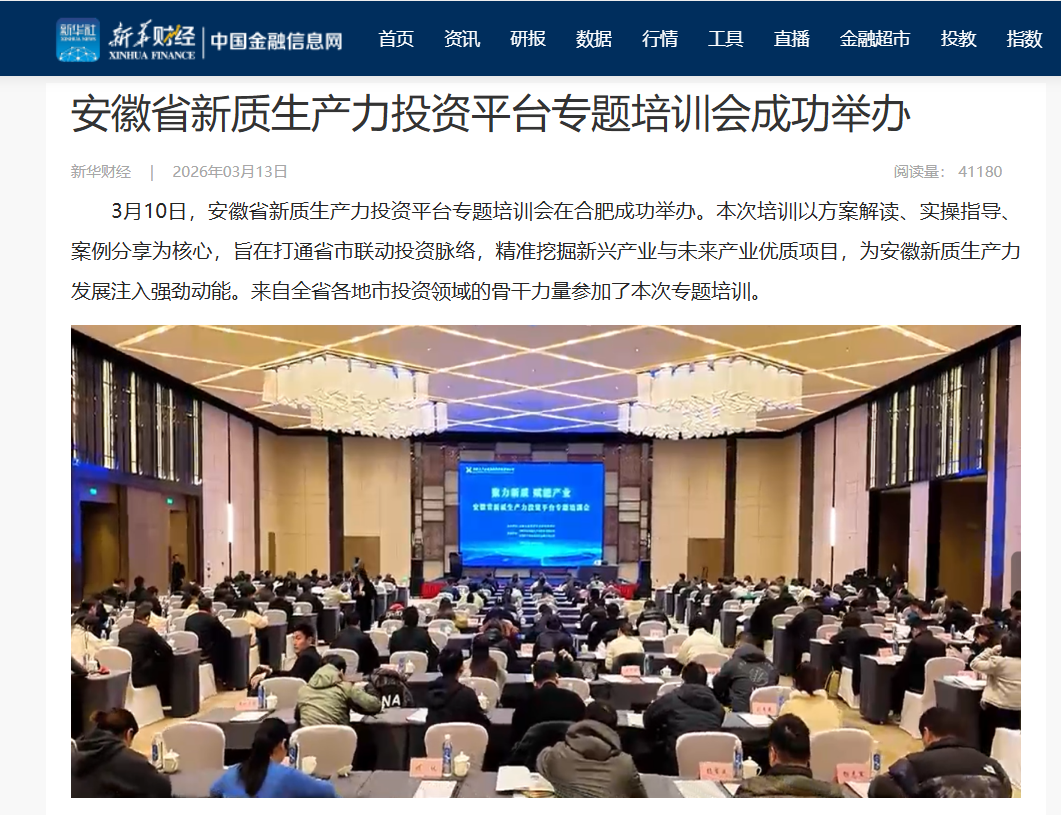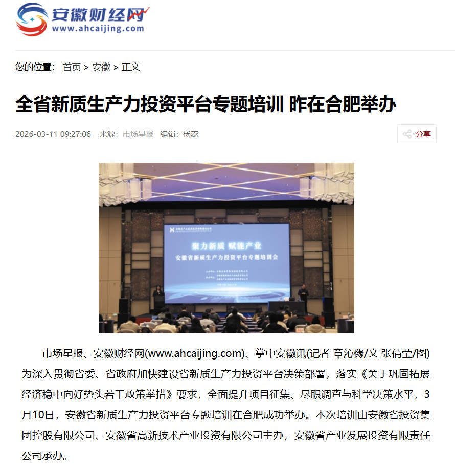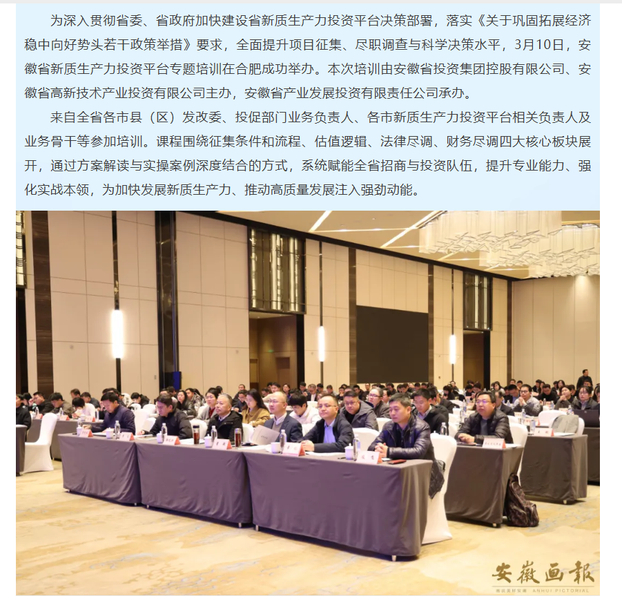 近日,新华财经、安徽财经网、《市场星报》及旗下星视频、《安徽画报》等多家媒体报道了由省投资集团、省高新投公司主办,安徽省产业投资公司承办的安徽省新质生产力投资平台专题培训活动。此次培训是安徽省产业投资公司深化省市协同的重要举措,通过“资源向前”的务实措施,推动优质项目精准对接资本,为加快培育新质生产力、推动高质量发展注入强劲动能。